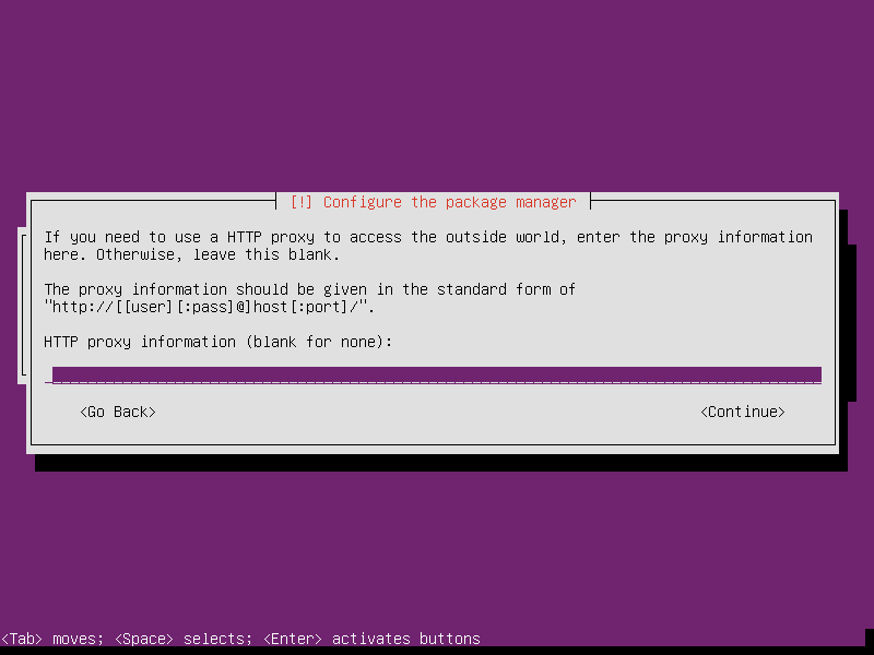 패키지 관리자를 실행하기 위해 외부로 네트워크 접속 시 프록시 서버가 필요하면 관련 정보를 입력합니다.