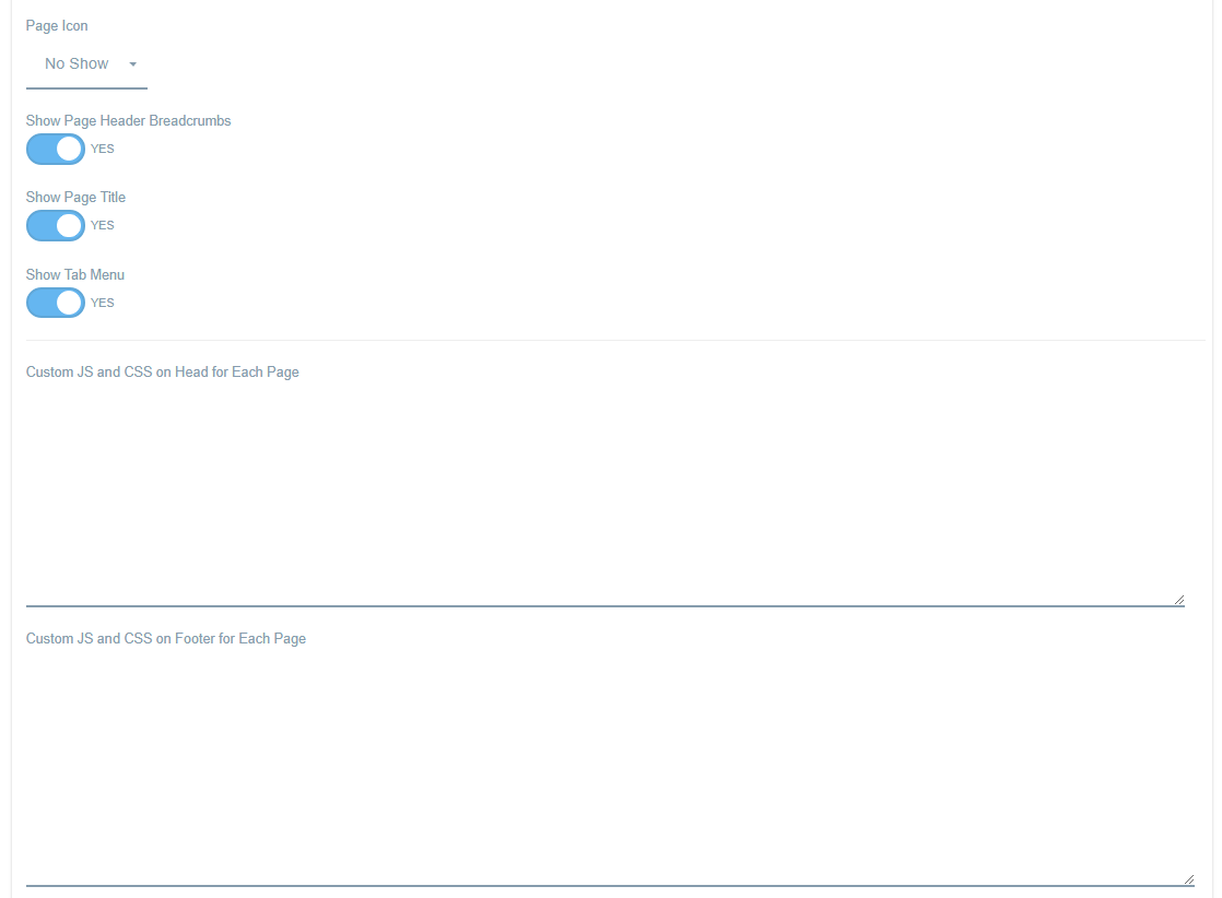 • Custom JS and CSS on Head for Each Page : Manage custom javascript or css tag on head section for this page.